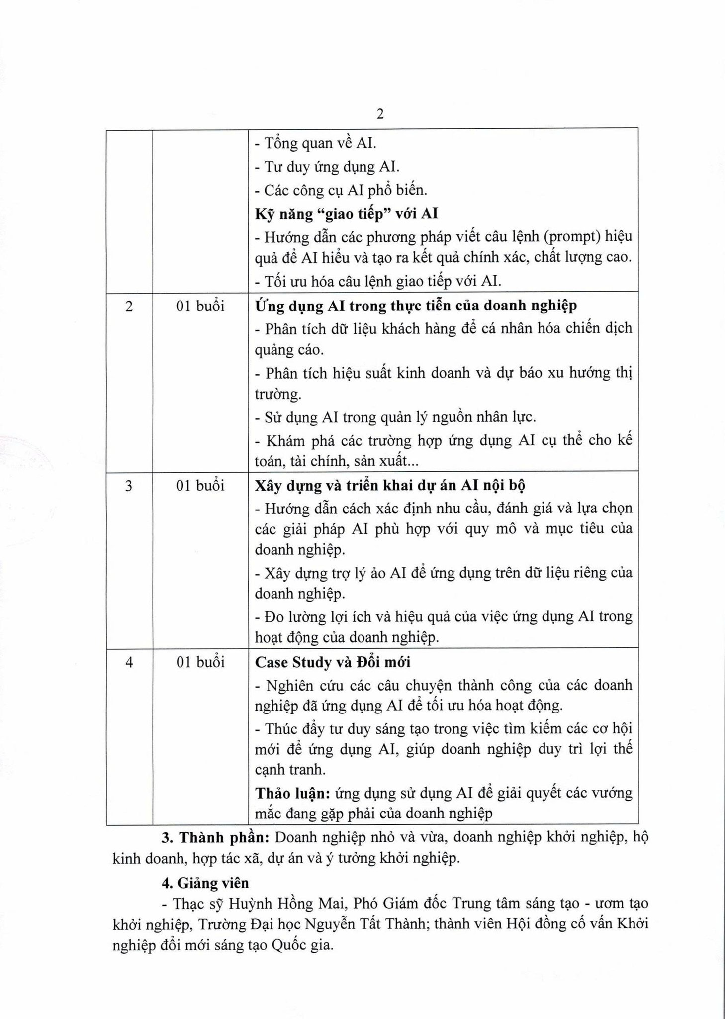 – Ngày 2: Ứng dụng AI chuyên sâu, thiết lập AI vào doanh nghiệp, áp dụng AI vào quản trị, tạo AI riêng mang màu sắc doanh nghiệp tăng trưởng kinh doanh