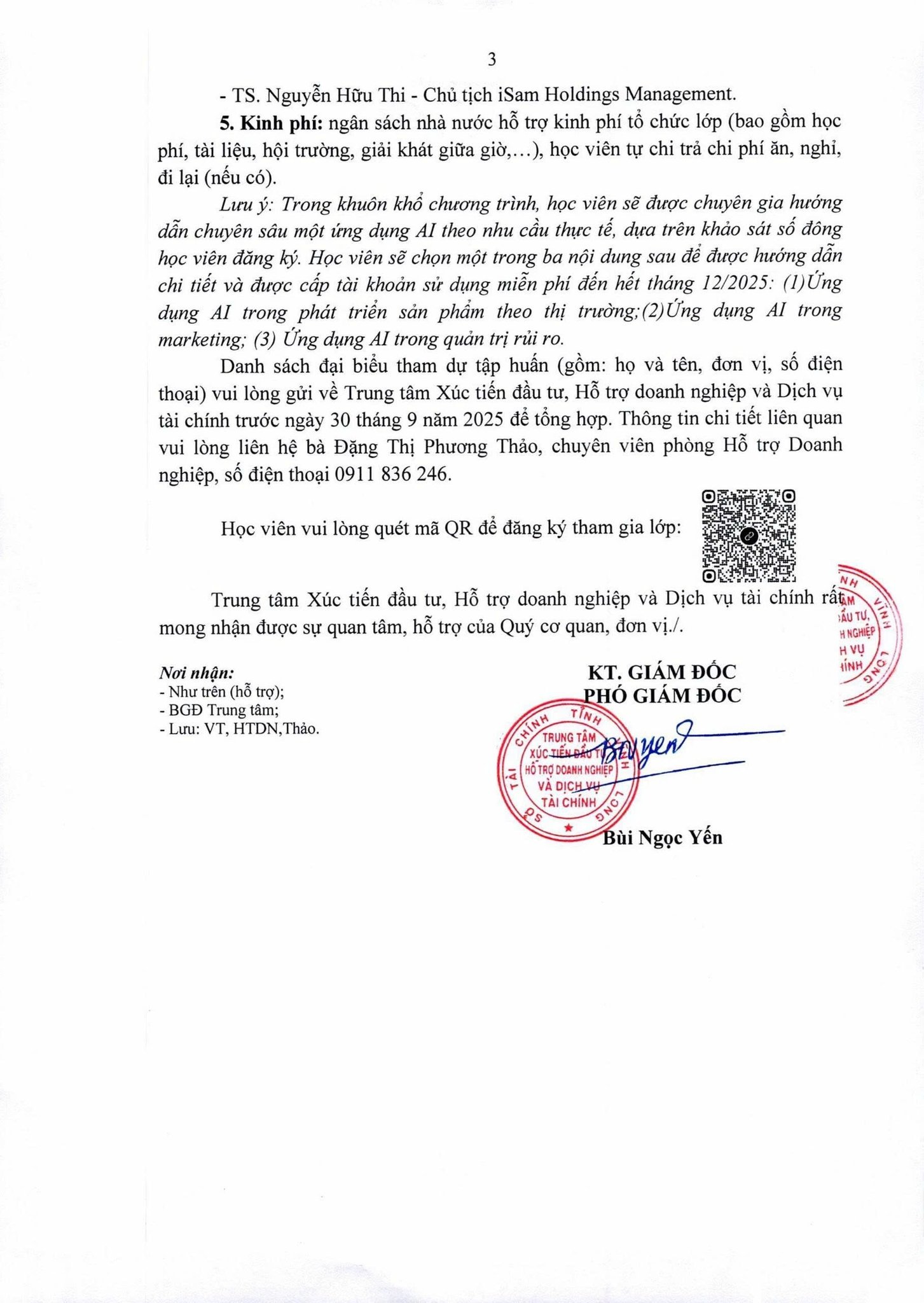 3. Kinh phí: ngân sách nhà nước hỗ trợ kinh phí tổ chức lớp (bao gồm học phí, tài liệu, hội trường, giải khát giữa giờ,…), học viên tự chi trả chi phí ăn, nghỉ, đi lại (nếu có).