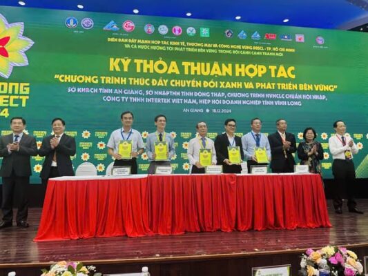 Tại Diễn đàn Mekong Connect 2024, diễn ra ngày 17-18/12/2024 tại Đại học An Giang, Intertek Việt Nam, đại diện bởi ông Cao Viết Thanh – Giám đốc chi nhánh Cần Thơ, đã cùng các cùng với đại diện Sở Khoa học và Công nghệ tỉnh An Giang, Sở Nông nghiệp và Phát triển Nông thôn tỉnh Đồng Tháp, Chương trình HVNCLC Chuẩn Hội nhập, và Hiệp hội Doanh nghiệp tỉnh Vĩnh Long đã tiến hành thảo luận và thống nhất ký kết cam kết xây dựng kế hoạch chi tiết để triển khai Chương trình Thúc đẩy Chuyển đổi Xanh và Phát triển Bền vững, hướng tới hiện thực hóa mục tiêu Net Zero của Chính phủ Việt Nam.