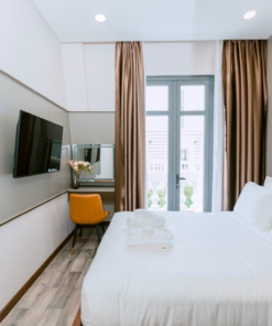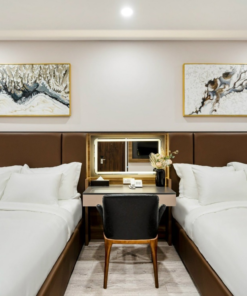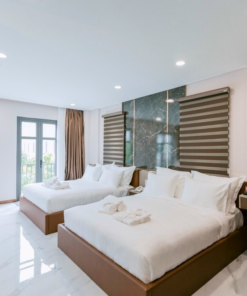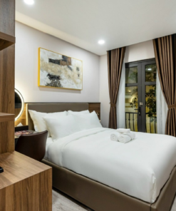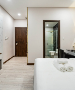Các phòng được thiết kế trang nhã, tinh tế. Bộ khăn 7 món gồm 2 khăn tắm cỡ lớn, 2 khăn vừa, 2 khăn mặt, 1 khăn chân thoải mái cho du khách sử dụng. Hệ thống giường ngủ sạch sẽ. Nệm phủ 3 lớp cực kì êm ái và trang bị 4 gối hơi cao cấp. Sử dụng chất liệu chăn gối cao cấp từ hàng Hanvico.