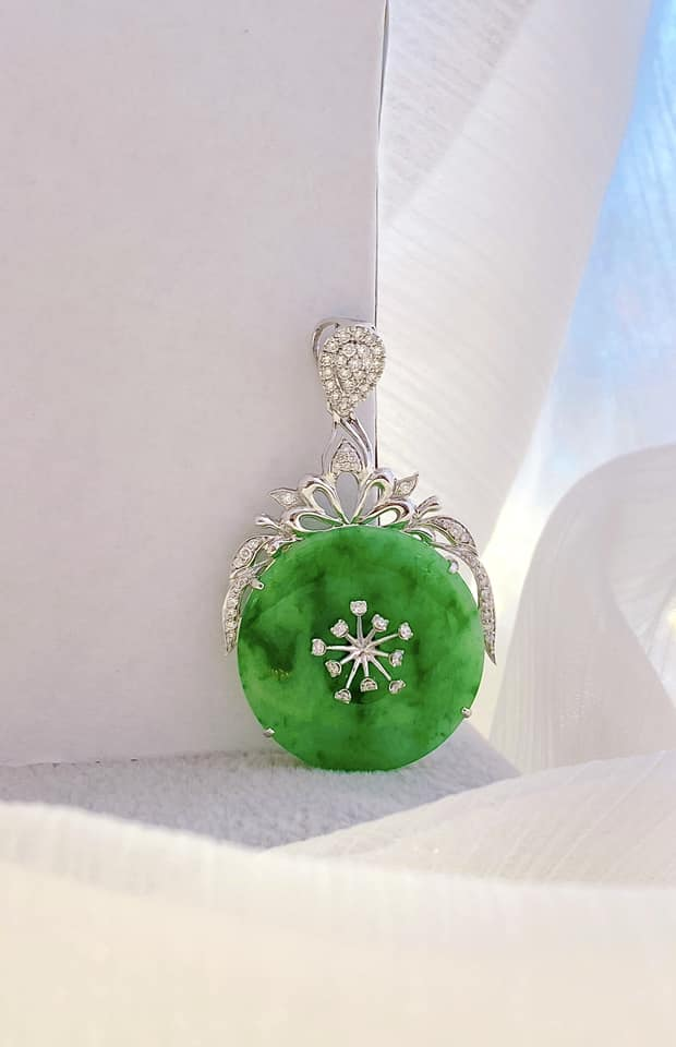 – Ngọc cẩm thạch được thiết kế cách điệu, họa tiết hoa văn sắc sảo. Tạo điểm nhấn đặc biệt ở giữa ngọc cẩm thạch là một nhụy hoa lấp lánh tấm kim cương.