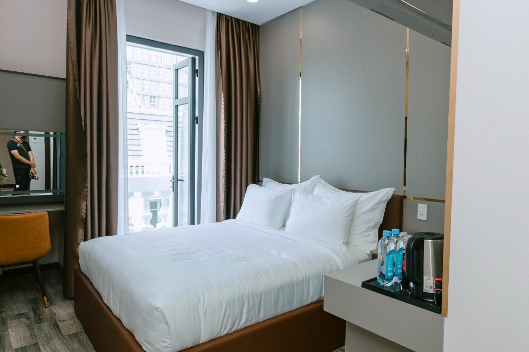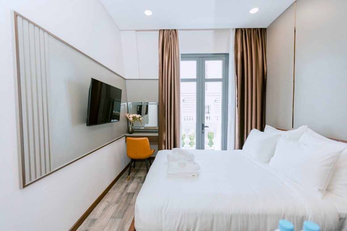 *Phòng Standard+: ban công, giường đôi 1m6x2m, diện tích 18m2.