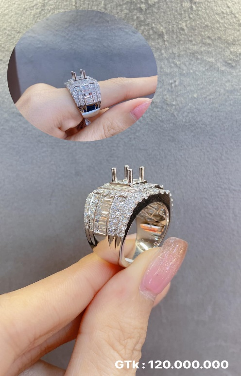 – Đai nhẫn được thiết kế bản to chắc chắn, mỗi bên có 1 hàng kim cương bagguette làm điểm nhấn ở giữa 4 hàng tấm tròn khoảng 70 viên chuẩn VVS1 xếp cạnh nhau tỉ mỉ, với mặt vuông xen 10 viên bagguette khá đặc biệt mang lại sự nổi bật cho chủ nhân.